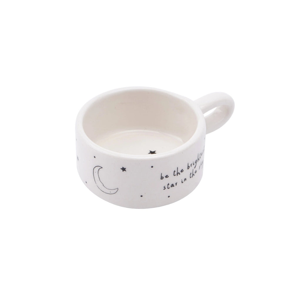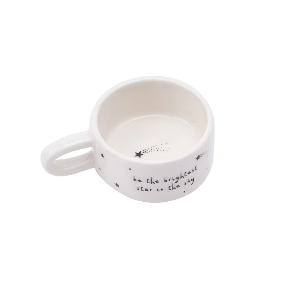Illuminate your space with this charming ceramic tealight holder from Send With Love. Finished in crisp white with an uplifting message encouraging you to shine brightly, it's adorned with delicate star and shooting star motifs. Perfectly sized to hold a single tealight, this thoughtful piece makes an ideal gift for someone special, a gentle reminder to embrace their inner light and sparkle.