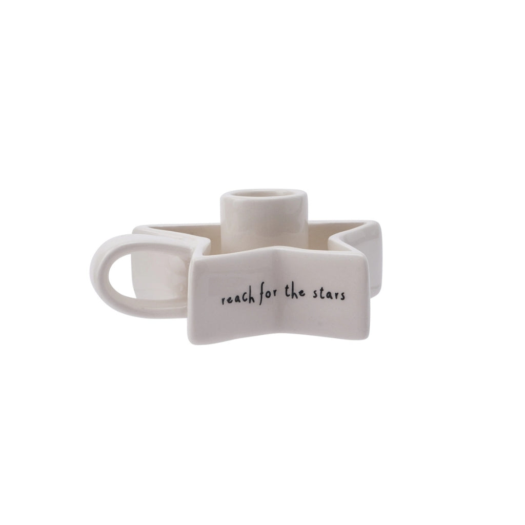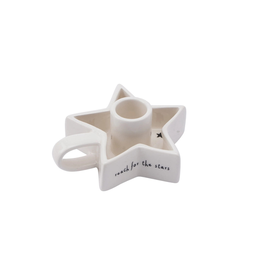 Illuminate your space with this enchanting star-shaped ceramic candlestick holder. Adorned with the inspiring message 'Reach For The Stars' and delicate celestial details, it creates a warm, inviting ambiance perfect for any room. Whether you're treating yourself or searching for a meaningful present, this charming piece arrives beautifully gift-boxed, ready to delight. An ideal keepsake for birthdays, celebrations, or simply to brighten someone's day with a touch of starlit magic.