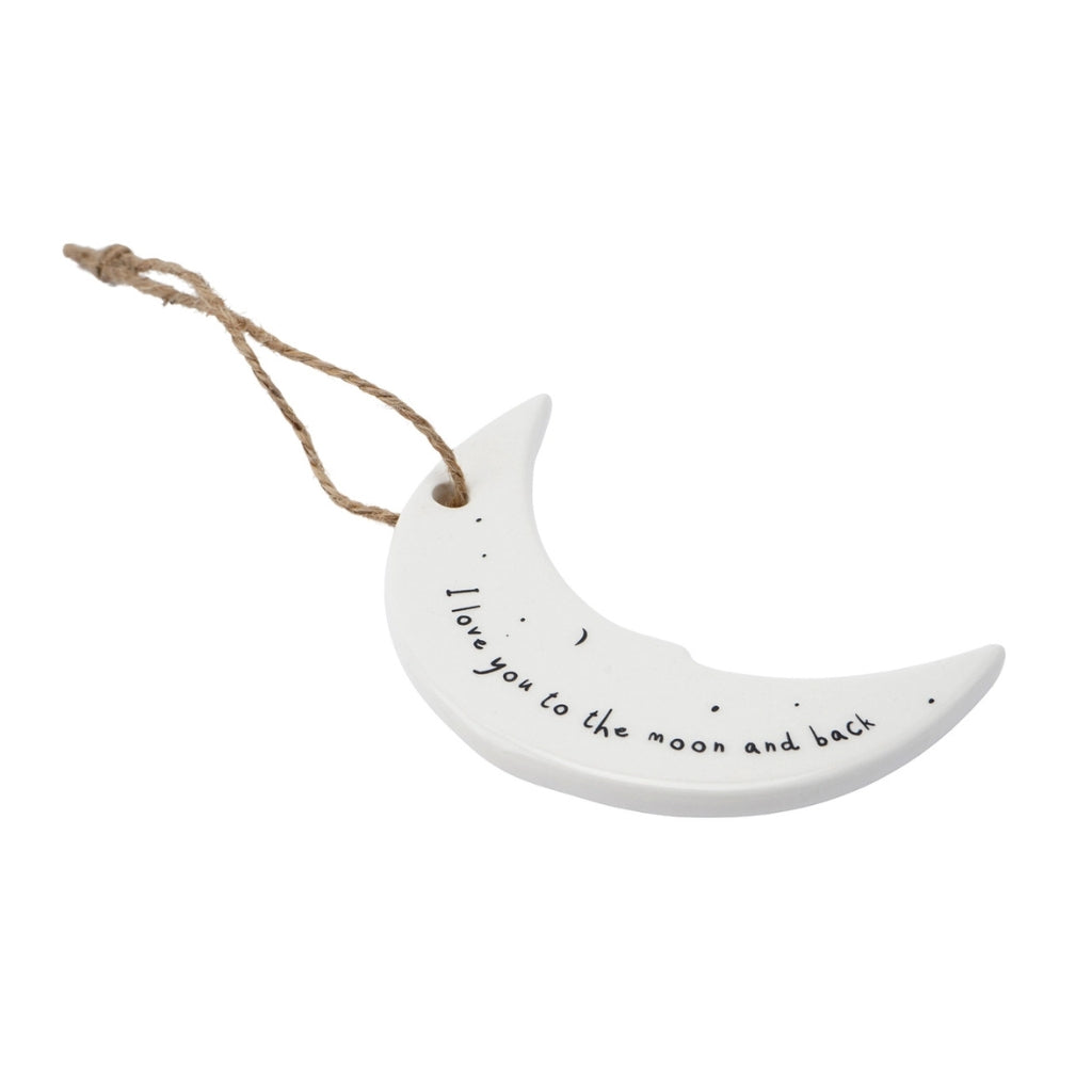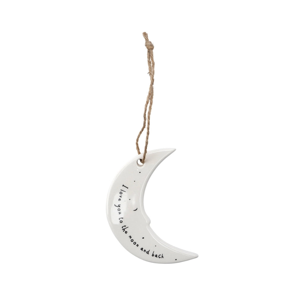 This enchanting ceramic moon hanger is a meaningful way to express your deepest affection. Hand-painted with the timeless message "I Love You To The Moon And Back," it captures emotion in a beautifully crafted keepsake. Perfect for gifting to someone cherished, this decorative piece brings warmth and sentiment to any home. Its artistic design and heartfelt inscription make it a treasured reminder of your love.