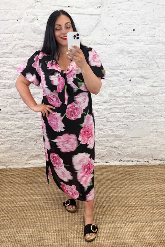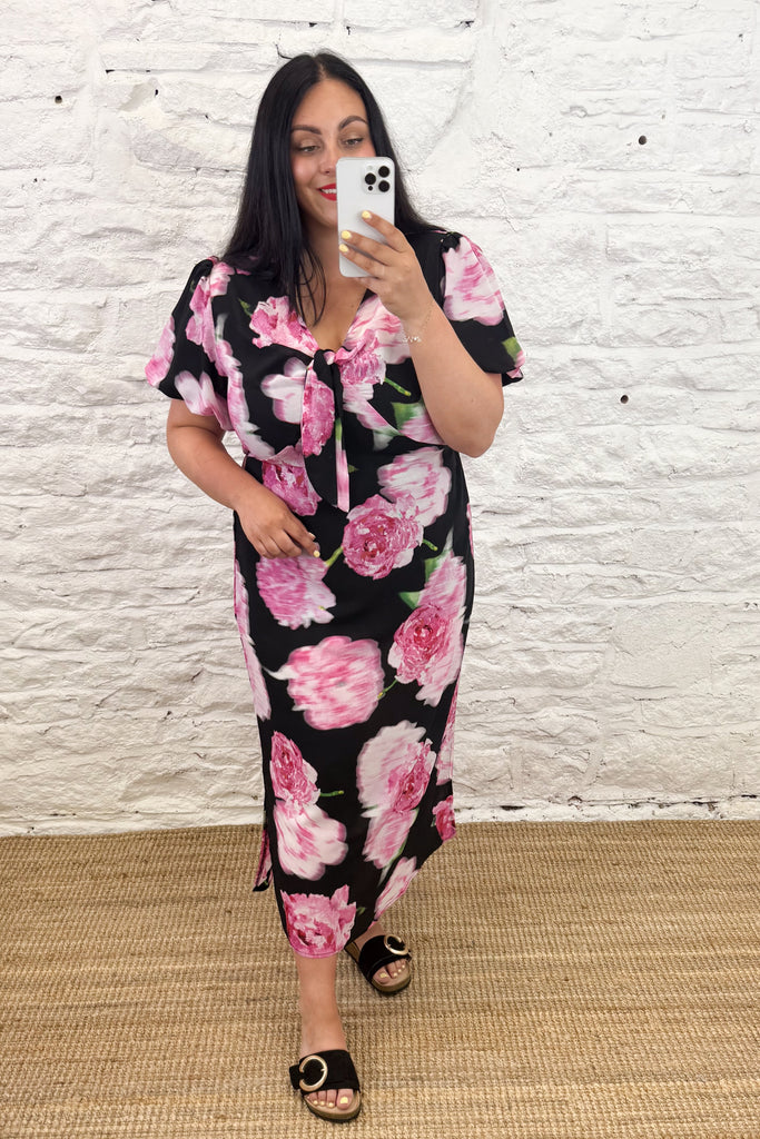 This Emily V-Neck Tie Dress offers a flattering fit with its v-neck cut and tie detail. The longline design and midi length add to its elegant silhouette. Expertly crafted for a stylish and sophisticated look.