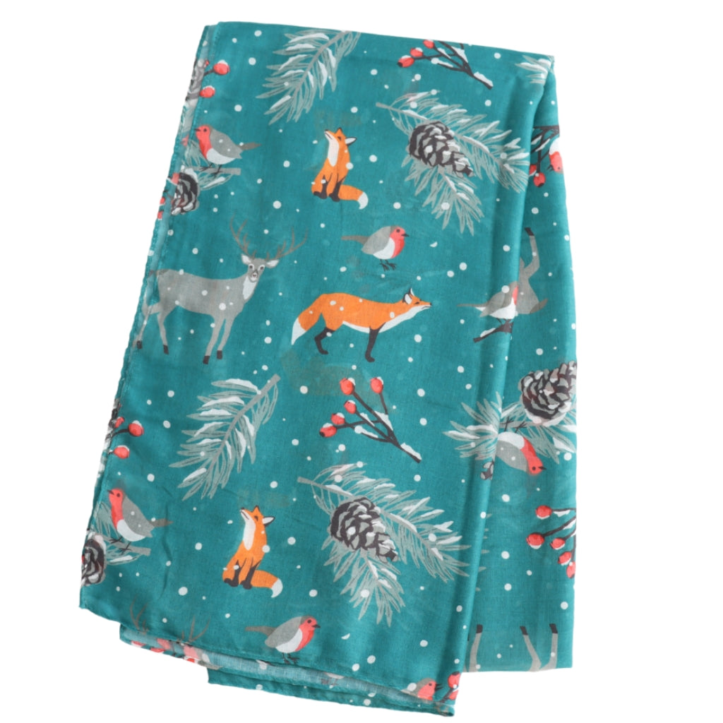 Wrap yourself in festive charm with The Winter Woodland Scarf in green. This lightweight accessory features a delicate snowy scene accented by a stag, fox, robin, and pinecones, blending nature’s beauty with holiday spirit. Perfect for adding a seasonal touch to any outfit or gifting to someone special, it brings cosy elegance and whimsical style to your winter wardrobe.