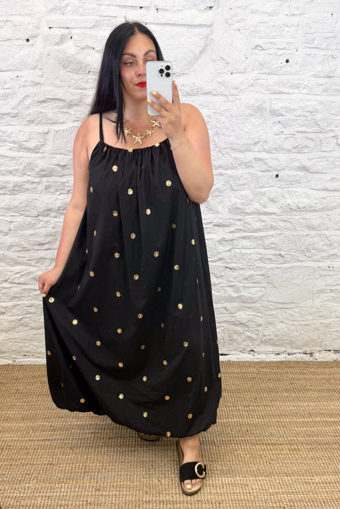 The Lucie dress exudes elegance with its cotton fabric, delicate thin straps, and stunning spot sequin detailing. The balloon hemline adds a touch of whimsy to this beautiful dress. Perfect for any occasion, it's a must-have in your summer wardrobe.