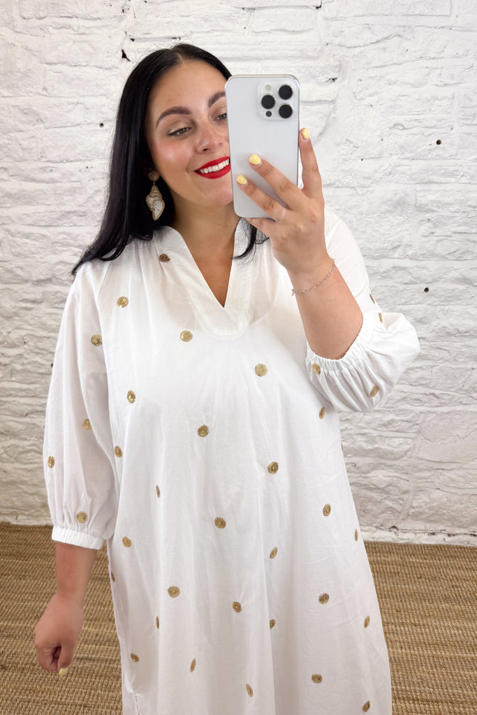 Step into style with The Lira Dress! This versatile dress features a delicate notch neckline and eye-catching gold sequin spots. Perfect for dressing up or down, make a statement at your next event with the added touch of sparkle.