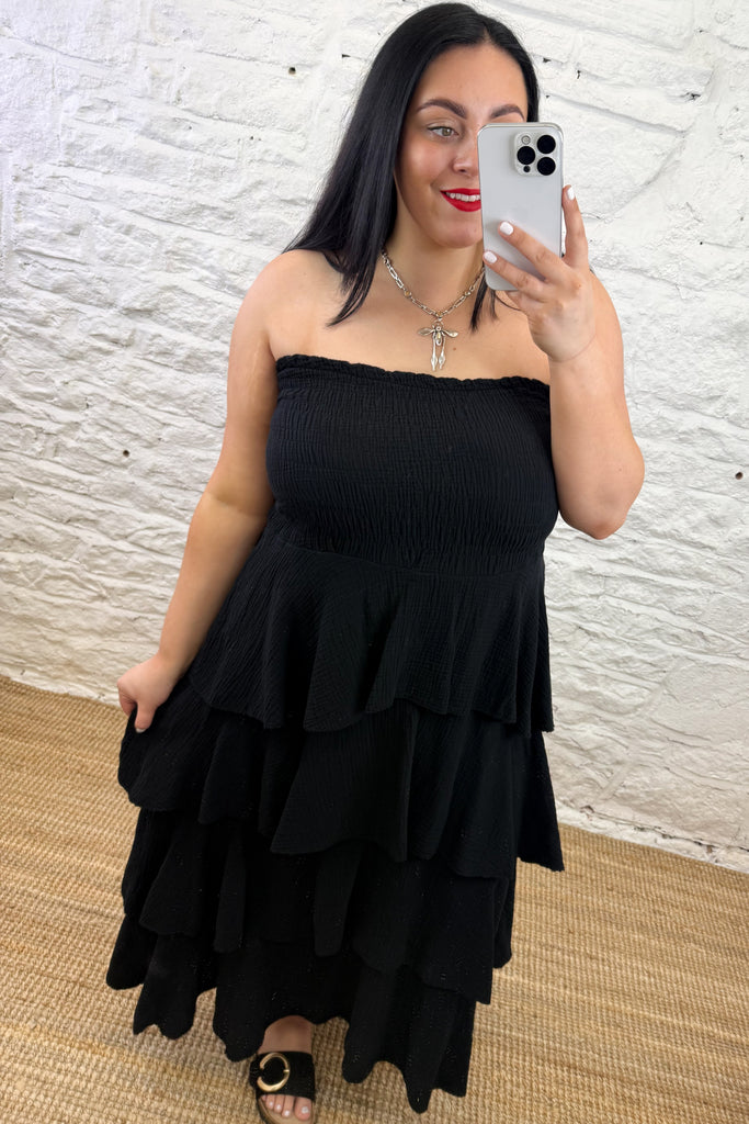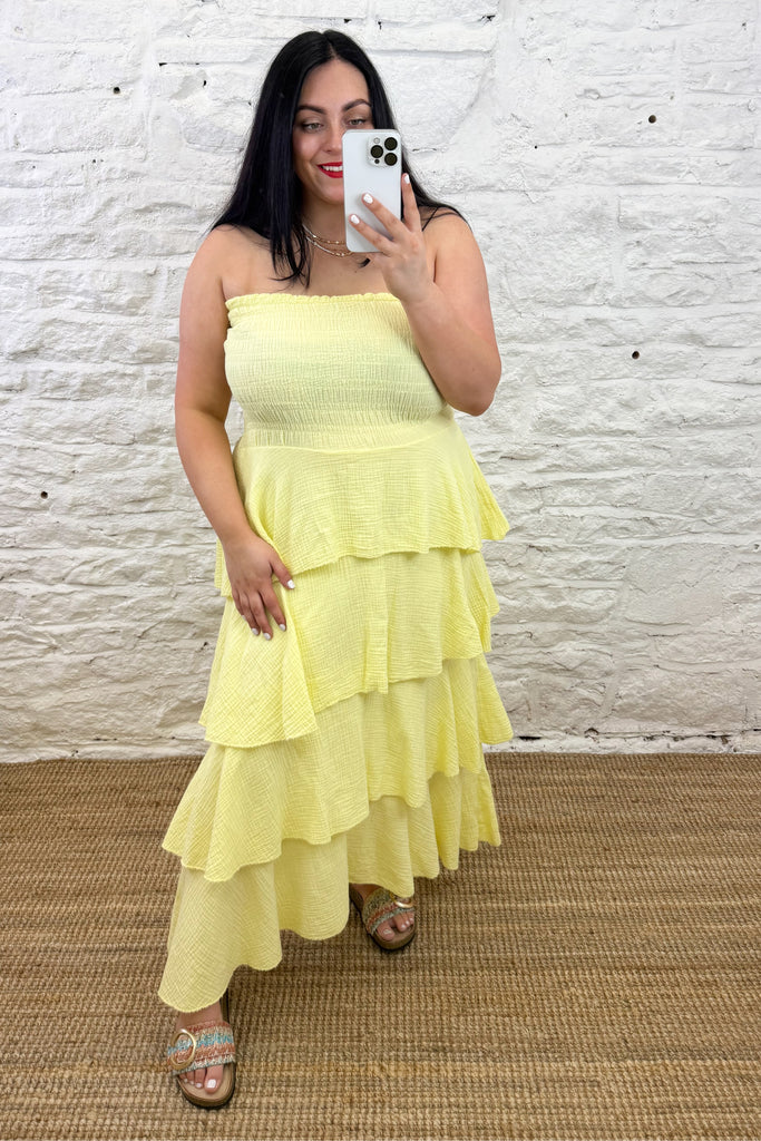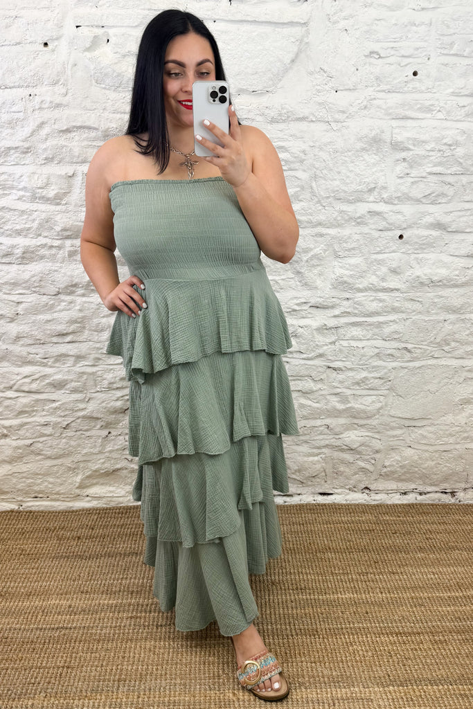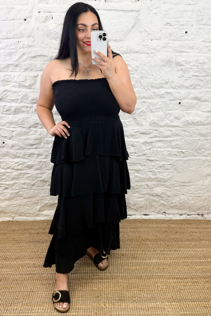 The Zaya Flutter Dress features shirred boob tube design with a layered flutter skirt. This dress offers a stylish and versatile look, perfect for any occasion. With its flattering silhouette and flowy, cheesecloth fabric, it is designed to enhance your figure and provide maximum comfort.