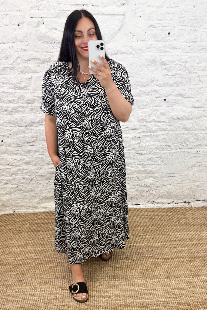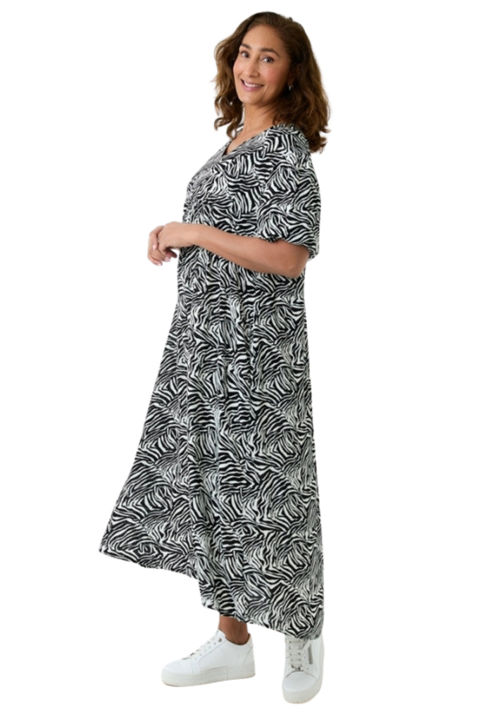 Expertly crafted with a unique zebra print, the Zinnia Puff Sleeve Dress adds a bold statement to any wardrobe. Made with high-quality materials, it boasts a comfortable fit and stylish puff sleeves. Perfect for any occasion, this dress will elevate your look with its eye-catching design.